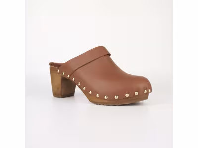 Clogs combining artisanal elegance and cozy comfort, thanks to their leather upper, classic wooden sole, and sheepskin insole; their gold studs and 7 cm heel add a sophisticated touch while remaining 100% made in France.